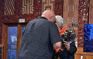 Image: Jeremy Tumoana, Kaiwhakahaere of Te Paepae Arahi is presented with a tāonga by Martha Gilbert, representing Te Ati Awa iwi, at Waiwhetu Marae.
